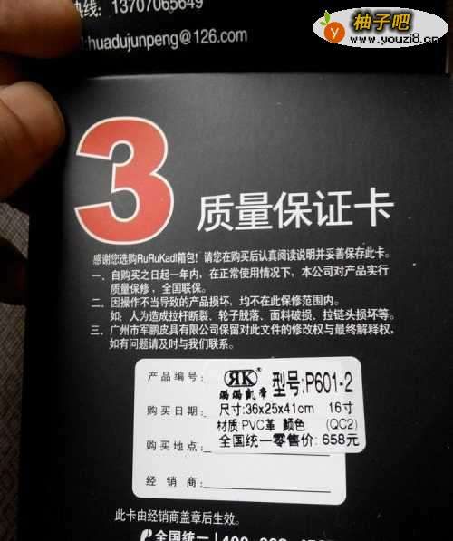 首先看合格证,上面有材质说明,材质分为ABS,ABS+PC,PC,铝框,主流材质ABS+PC