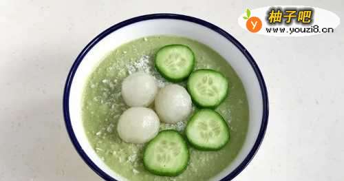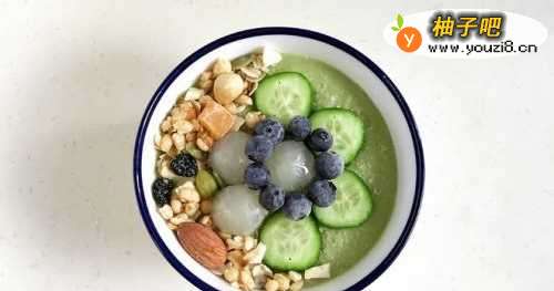 7把搅打好的思慕雪倒入碗中,撒上少许椰蓉,放上切好的小黄瓜片,放上去壳的龙眼。
