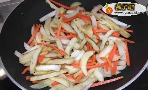 锅内放入少许油炒香洋葱,再加入甜不辣和红萝卜,拌炒至7分熟,拿出放入另一盆中