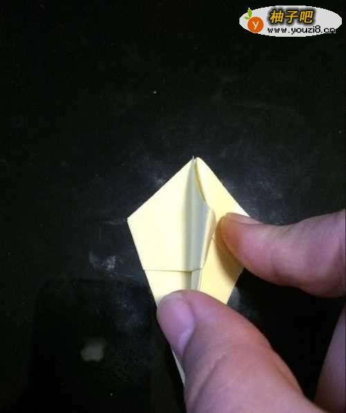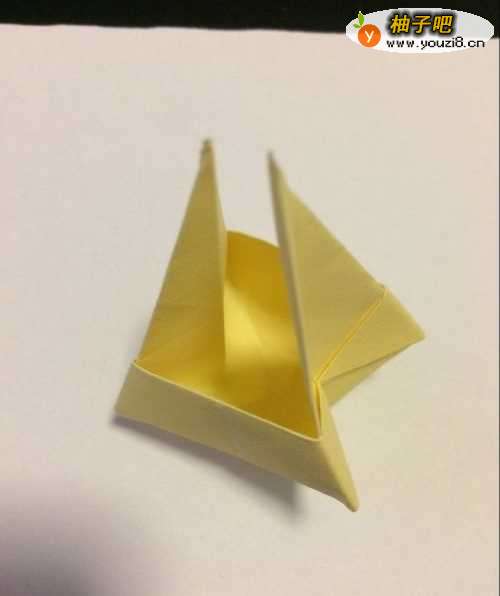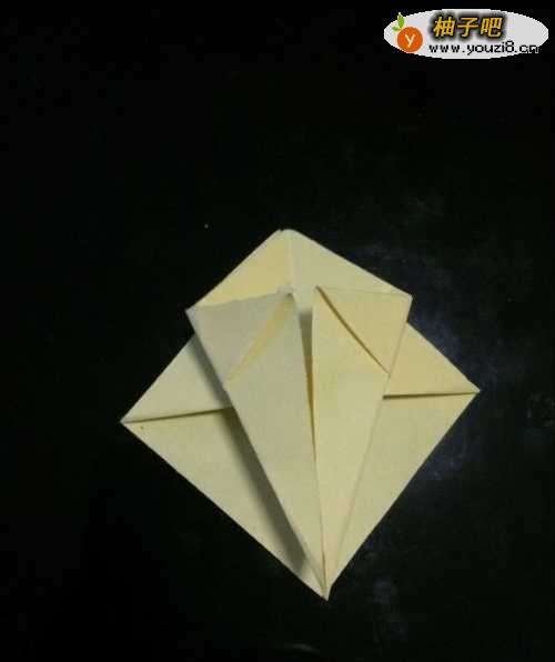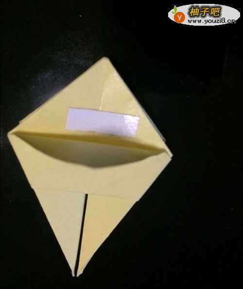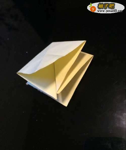 3折叠好后,把开口处,用食指向里面顶住,反转折叠成里面有2个尖脚的正方形。