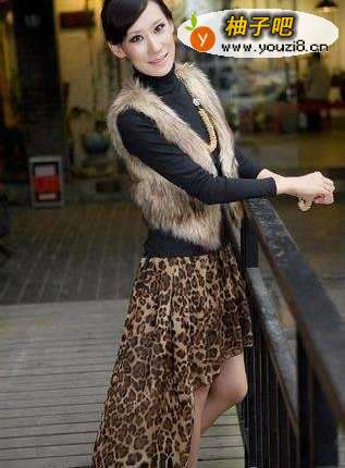 7不规则的豹纹裙野性十足,浅咖色的皮草内搭黑色长T,低调的华丽。