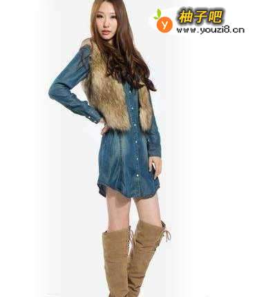 6简单的皮草装点一下超正,长款牛仔衫上身效果非凡,搭配长靴真心好看!