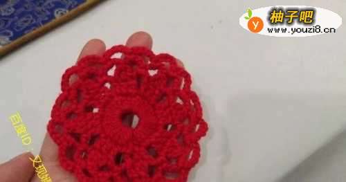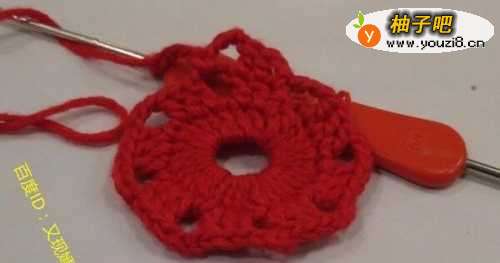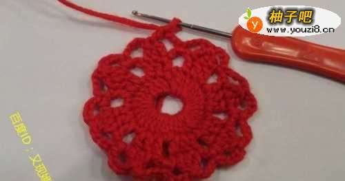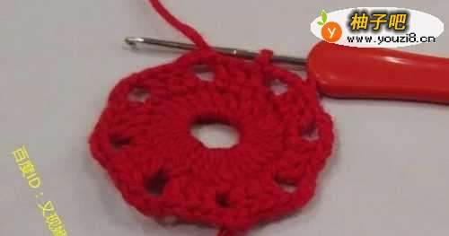 5第四圈:在上一圈最后钩的一个长针形成的洞洞里钩织一个短针,然后拉5个辫子针,在上一圈4辫子针形成的洞洞里钩织一个短针,再拉5个辫子针,再在下一个4辫子针形成的洞洞里钩织一个短针,这一圈都是这样的钩织方法,然后与第一个短针作引拔针连接,这样一个花样就钩织好了。