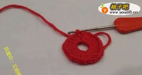 第一圈:环形起针,拉3个辫子针,然后在线圈里钩织31个长针,与拉的3辫子针作引拔针连接,完成第一圈。