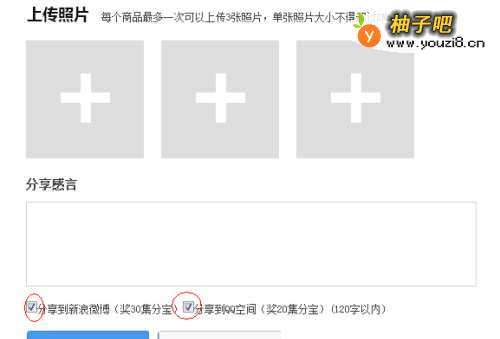 3上传符合要求的图片+分享感言晒单,同时分享到新浪微博+QQ空间。 (PS:记得要勾选分享到新浪微博和QQ空间两个地方哦~这样才可以得到50集分宝!)