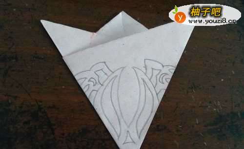 5在折好的彩纸上画上玫瑰花,然后用剪刀沿线剪下来。