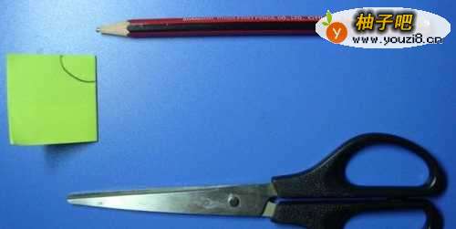 把绿色卡纸折成正方形,然后拿出铅笔在正方形卡纸上,画上圆弧形。并用剪刀把卡纸剪出来,如下图所示。