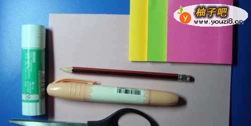 做生日贺卡材料有:三种颜色的卡纸、剪刀、胶水、铅笔、彩纸,大彩色笔,如下图所示。