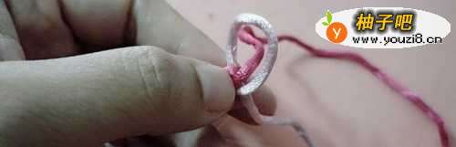 6把粉色圈放在手指的正面,然后用红色线绕手指转一圈。
