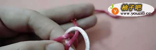 9现在是重复第一个金刚结的步骤,把粉色圈从手指上取出。