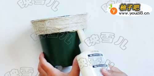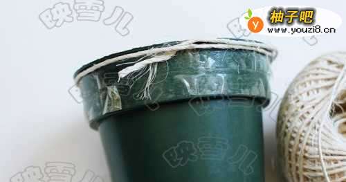 3将麻绳的一端粘到双面胶中间,然后开始从上向下缠绕。最后将麻绳的末端塞入上一圈的麻绳里。或是用快干胶直接粘牢。