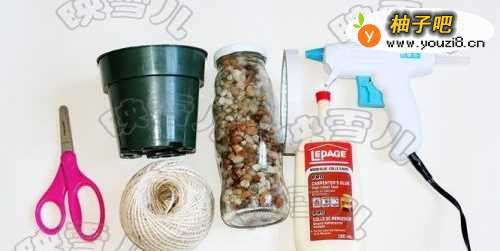 塑胶小花盆一个,双面胶,快干胶,麻绳,小彩石等。