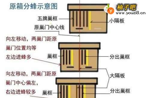 操作方法是先用大隔板把箱隔死成两部分,两边的蜂要互不相通,开两个巢门,提部分脾到另外一边,组织成交尾群,盖上复布,让两边蜂不能通过隔板上面(半天后可以介入王台),比如你原来开的左侧的巢门,现在把箱往左移动,让原巢门位置处在现在的左右两个巢门之间,和前面的原理相同,哪个巢门离原巢门位置近,哪边的蜂就会多些。