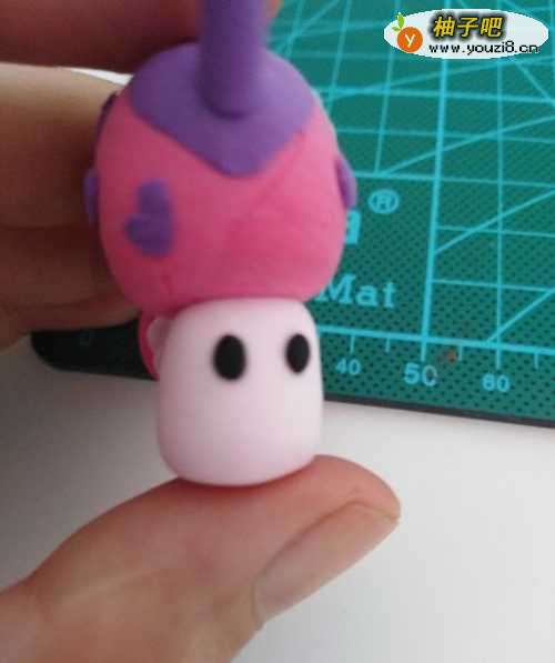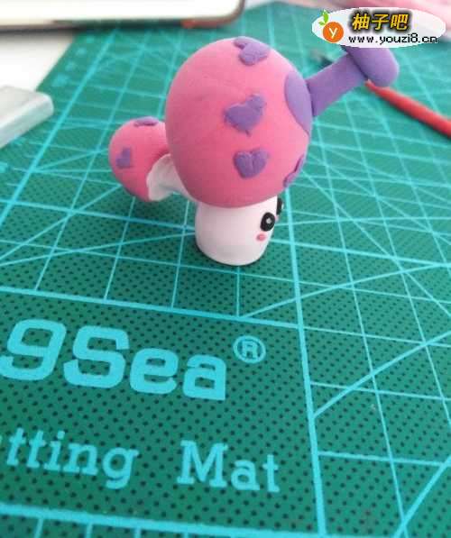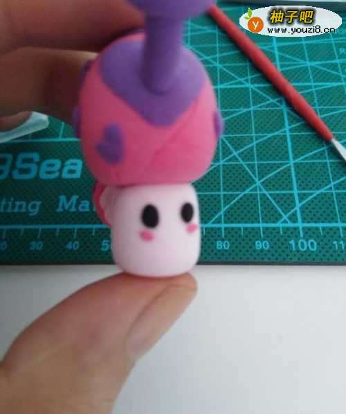 9玫红色粘土取两个很小的部分,做出眼睛下方的脸上的绯红部分,可爱的香水蘑菇就做好了