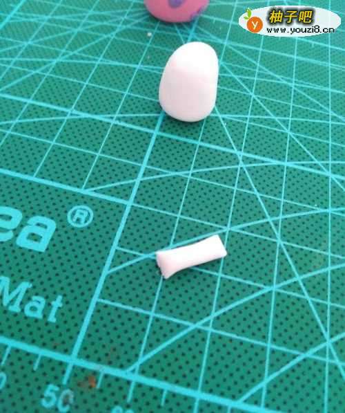 7取白色粘土,做出蘑菇底部的柄状,粘在蘑菇下方,大小蘑菇都粘结好