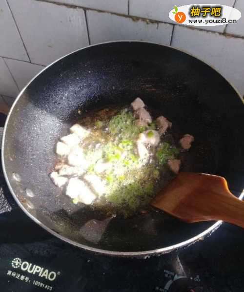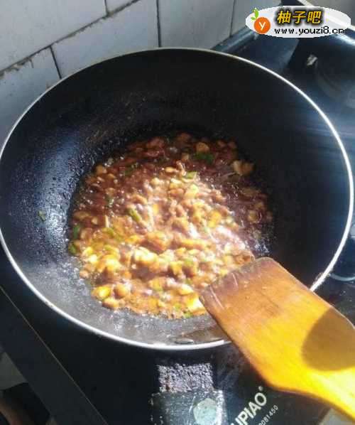 5倒入事先切好的蘑菇丁翻炒一会,加入3勺豆瓣酱。