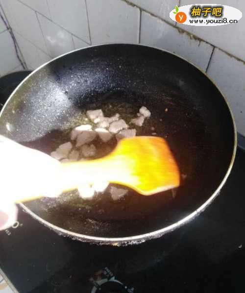 3将肉块倒进去翻炒,直到肉色改变。