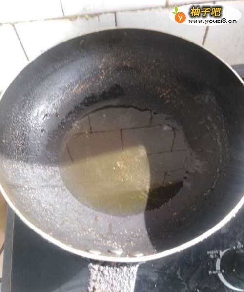 2将锅烧热,确定没有水后倒入一大勺花生油,小火等待油开。