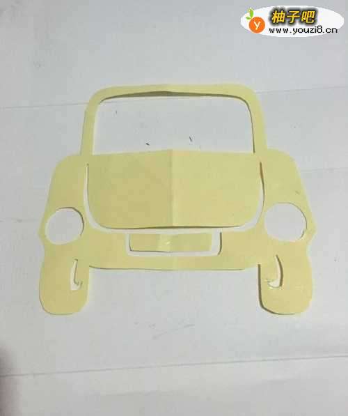 6第六步 剪完外围多余的彩纸之后 再剪去其它涂实的地方 包括前面的大灯挡风玻璃 轮胎等等 然后取开铺平 一辆简单漂亮的小汽车就完成了