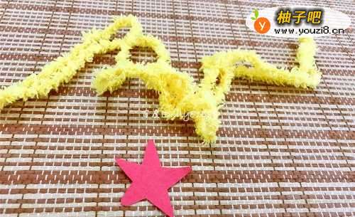 8准备一段橙色的毛绒绒的线和一个红色的五角星。