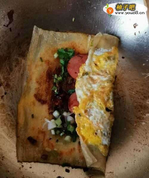 4用筷子把烤冷面饼翻折一下,把它给卷起来,这样料就不会掉出来。
