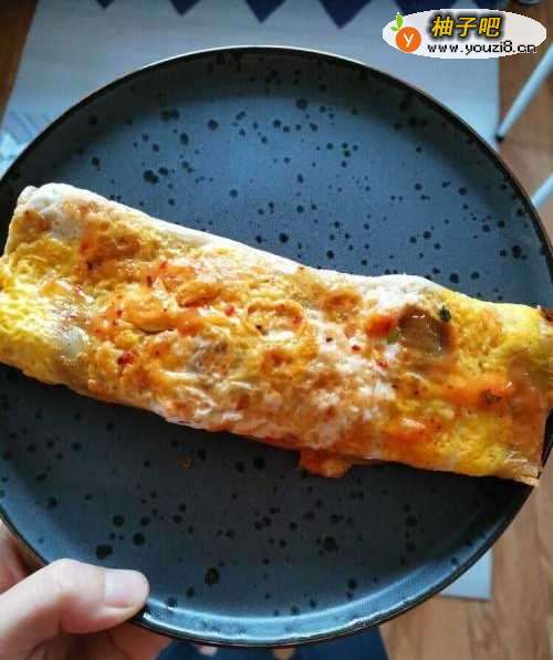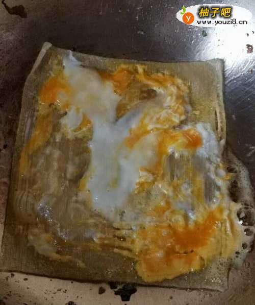 2等鸡蛋差不多牢固在面饼上,翻面并把火给关掉,用余热把鸡蛋煎熟。