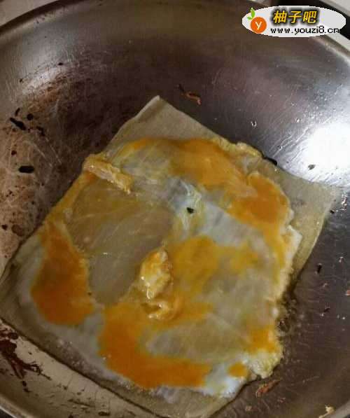 起锅,锅底倒入一点点油,然后放入面饼,在把鸡蛋打入在面饼上,弄散,然后把火腿肠放到旁边煎着。