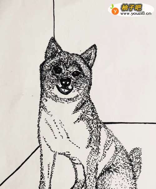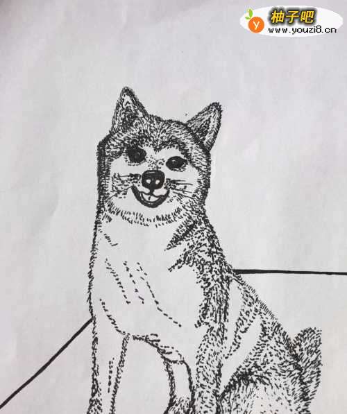 4柴犬身体的毛发手法同上,用笔在柴犬的身体、四肢和尾巴毛发。在狗狗鼻子周围添加胡须,最后画出墙角和地面的轮廓线条。