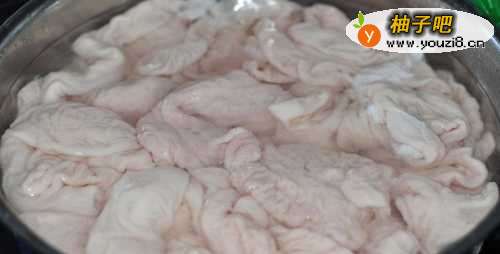 3捞出大肠晾凉,把肥肠切小块。