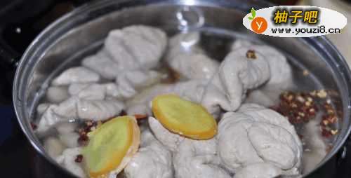 2将大肠焯烫后换清水,加入姜片,大料,料酒和酱油大火煮开,转小火煮至肠子能用筷子扎动。