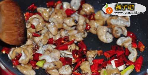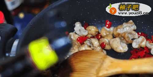 7把肥肠下入煸炒。