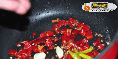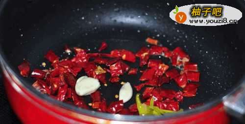 5起锅热油,把葱姜蒜片下入,下入干红辣椒煸香。