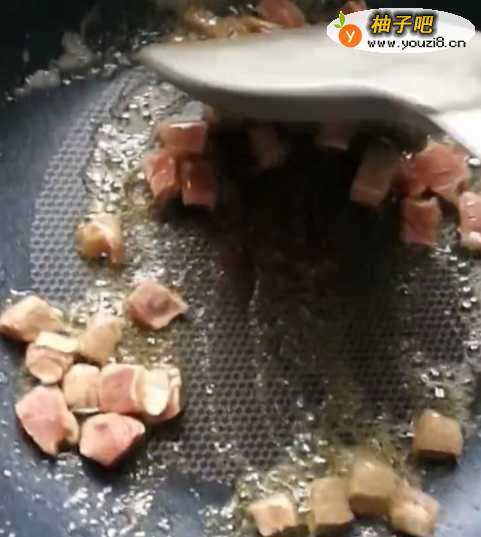 3锅内放黄油炒化,放入牛肉粒炒熟;