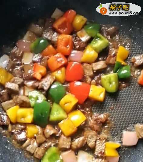4加入洋葱丁和彩椒丁,放入适量的生抽酱油,放入一勺黑胡椒酱;