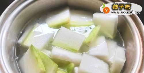 3加入去皮洗净切成块状的冬瓜,煮至冬瓜软烂。