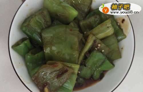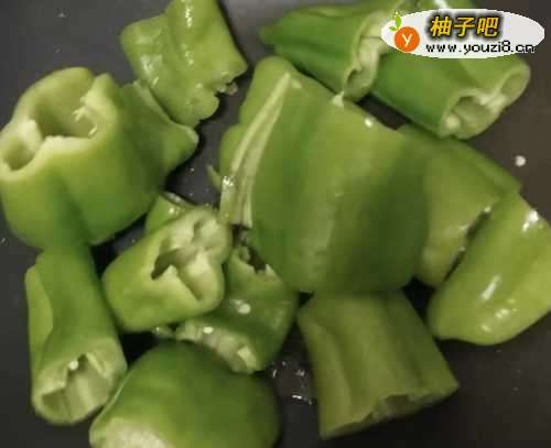 4用小火将青椒煎至青椒两面焦黄起皮,变软