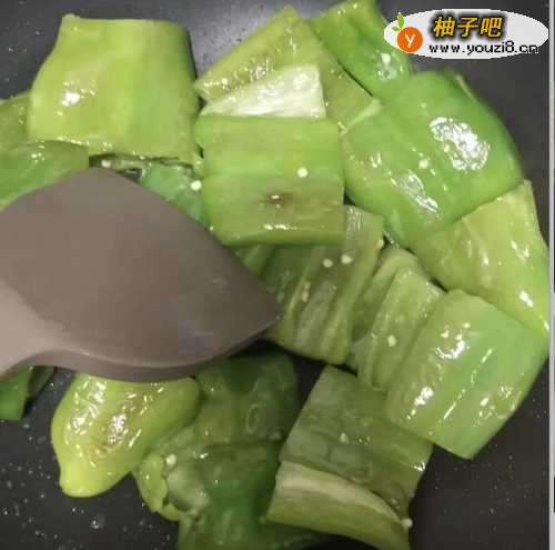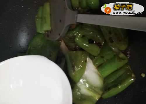 3锅里倒油下青椒小或煸炒,用锅铲轻轻按压青椒,并不时的将青椒翻个面,使之均匀受热