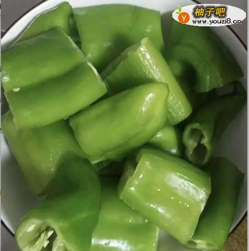 2青椒洗干净切成三段,剔除里面的籽,大约就是4厘米左右(太大个了,又太长,如果整个下锅受热不均匀,不易熟。)