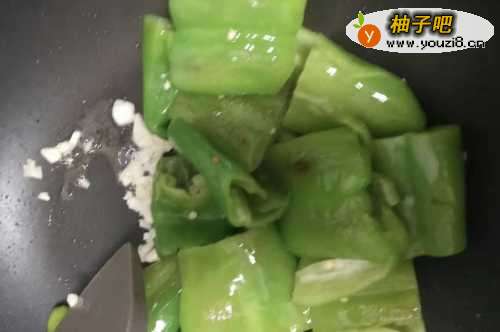 5将青椒拨到锅头的一边,放入蒜末煸香。