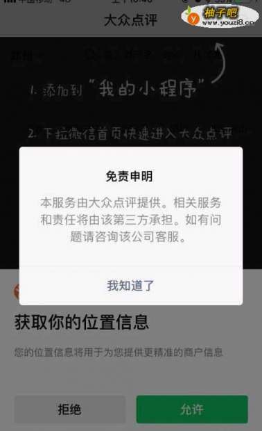 5点击吃喝玩乐,页面出现一个免责申明,点击我知道了,见下图