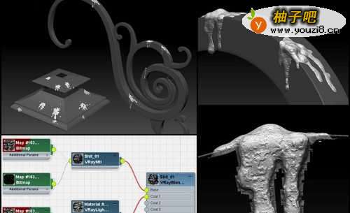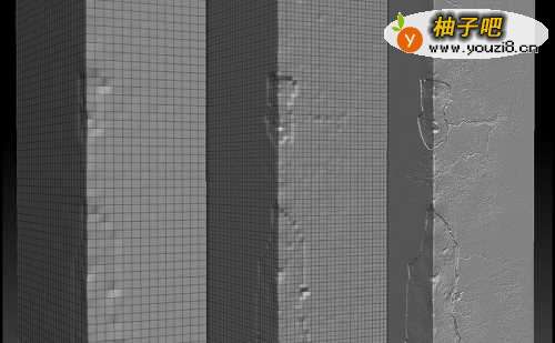 5第二材料比所述第一轻得多,并用于创建的防尘效果。世界Z轴方向有衰减的地图被用来作为一个混合的面具,和我融合了金属质感的黑色和浅反转的正常功能,在vraydirt地图选项。它给出了一个非常微妙的影响,但它确实有助于使物体看起来更真实, 然后是时间移动到ZBrush。这是一个伟大而强大的工具,它帮助我实现不错的细节在墙壁上(Fig.06)。要做到这一点的基础对象在3ds Max中创建和解开。在Photoshop中,我创建了一个漫反射纹理,并根据它的黑白图,作为一个面具雕刻(Fig.07)。在ZBrush,我申请了这张地图,做了个面膜,用标准的刷子,雕刻的细节。这种技术给了我更多的控制权水平位移,是很容易使用。