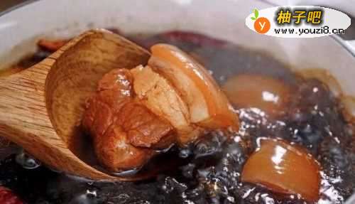 4带皮五花肉在凉水中浸泡过一小时后放入高汤中,加入装有香料的底料包、干红椒、红泡椒、冰糖、盐、花雕酒,生抽老抽。