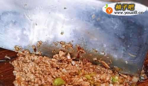 6捞出五花肉,连皮一起剁碎,加入青椒末。(西安肉夹馍不加青椒)
