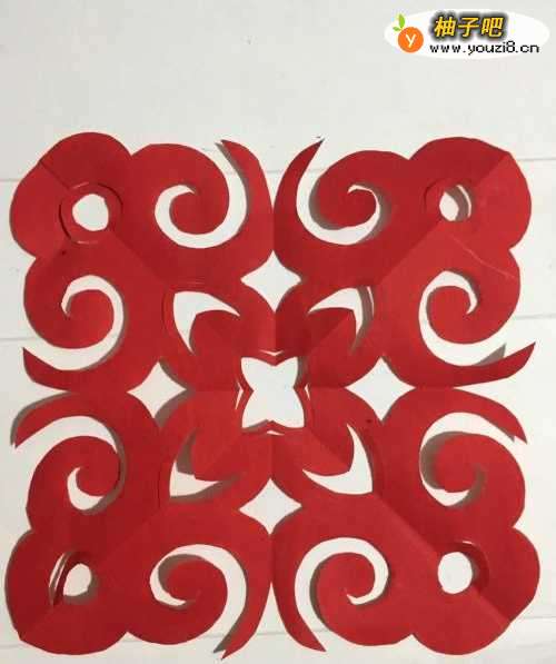 6第六步 剪完外围之后 再慢慢剪去里面的如意轮廓外的彩纸 剪完之后 取开铺平 一朵四角如意就完成了