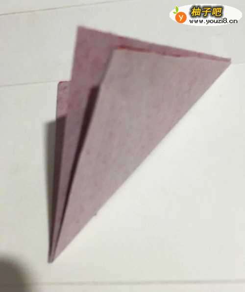 第一步 首先把一张17厘米X17厘米的正方形红色彩纸 从下向上对折整齐
