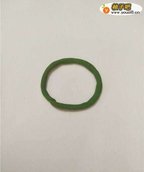 2用绿色搓成一个细细的圆圈,粘在身体上方,当作它的脸。