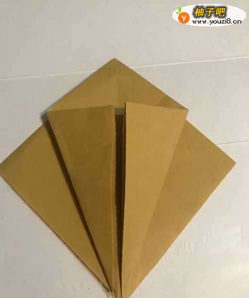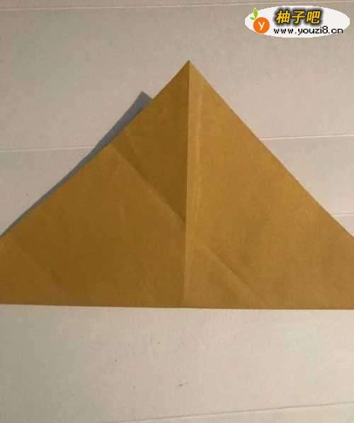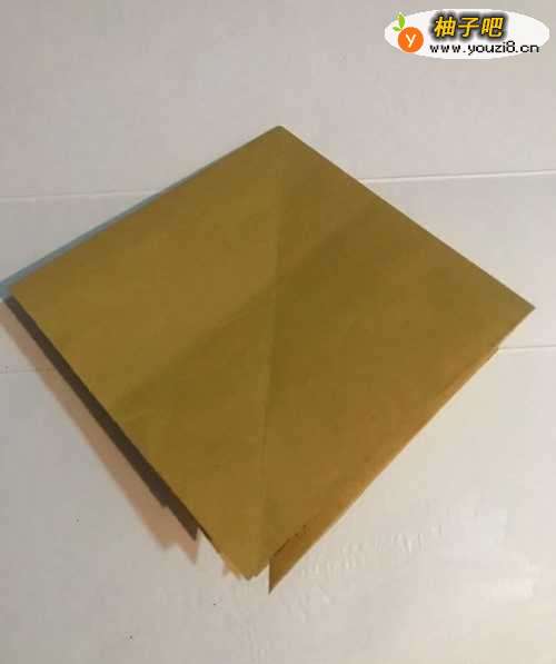 第一步 拿一张长X宽都是16厘米的正方形黄色彩纸 从下向上对角折叠 然后取开把折痕竖起来 再次从下向上对角折叠