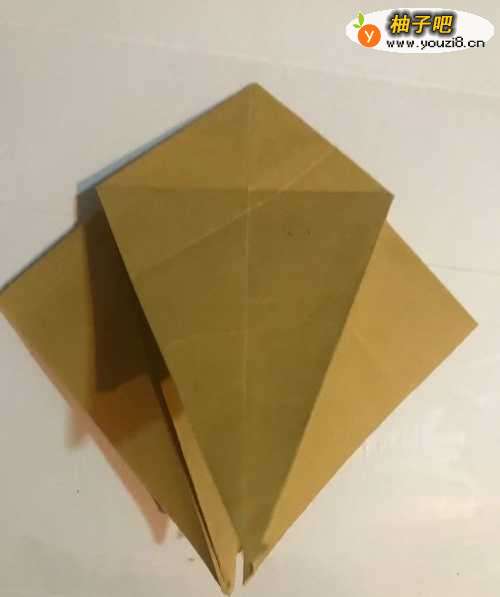 5第五步 底上两边都折好之后 掀起上层的下角向上对准交叉点折倒 然后留一小段再向下折倒 作为啄木鸟的头部