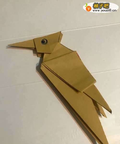 9第九步 剪完尖角之后 拿起来撑开啄木鸟头部下面的空余部分向下挤折 然后再用黑色水笔给它画上眼睛 再整理一下 一只可爱的啄木鸟就折叠完成了