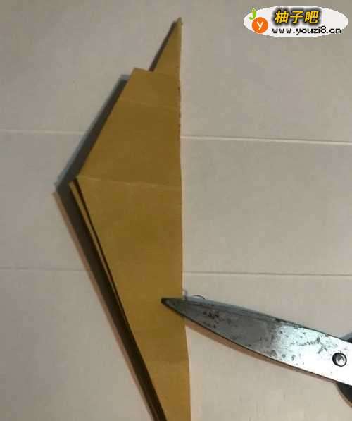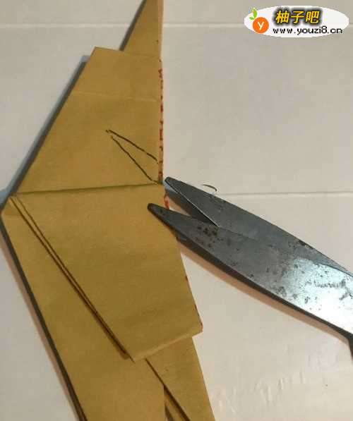 8第八步 折好一只翅膀之后 另一个翅膀同样折叠 然后按用黑色水笔画的尖角用手工剪刀剪去